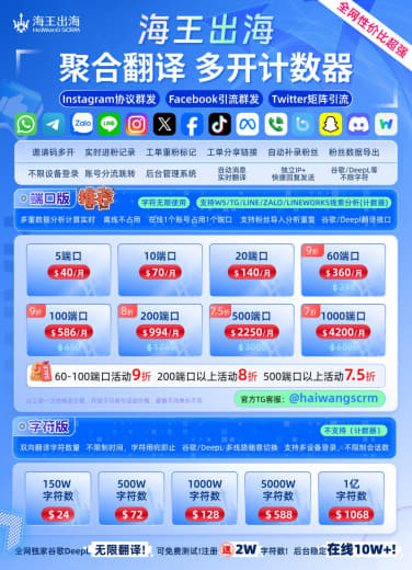 ▶️端口:【登录在线1个账号占用1个端口,离线不占用端口,可多设备,多账号登录,包月无限字符,可使用WS,Zalo,Line,TG-W,line-works,线索数据记录分析功能!⏸字符:【双向翻译字符数量,可多设备,多账号登录,不限时间,不限翻译通道,不可用线索数据分析【计数器】功能 !